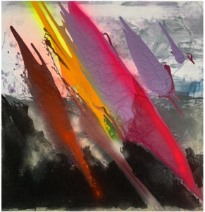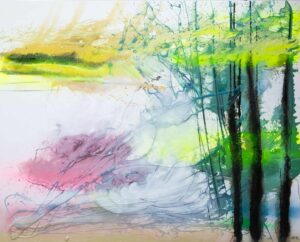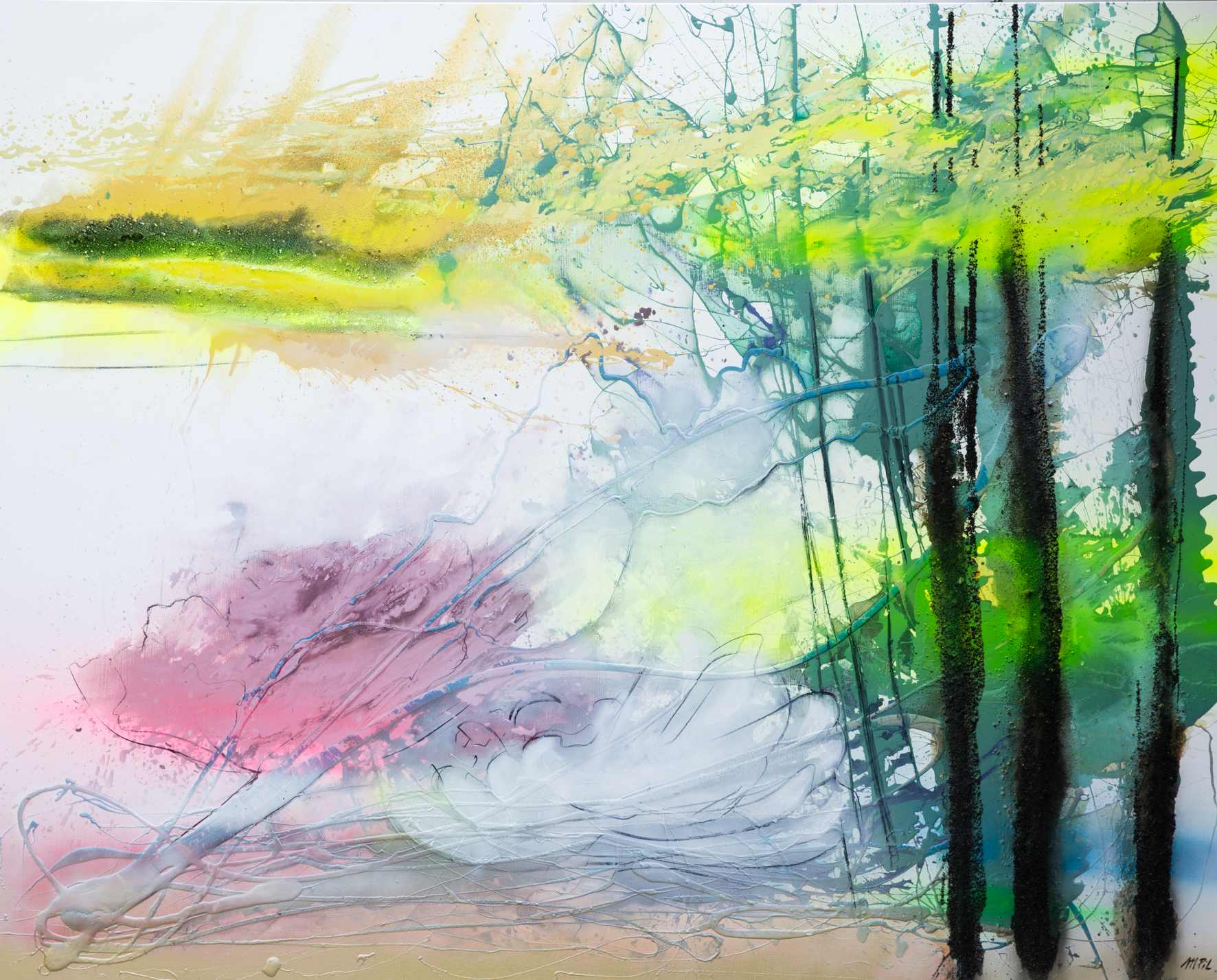 Je kunt allerlei soorten texturen gebruiken uit de natuur voor abstracte schilderijen met structuur. Enige tijd geleden viel er in de lente een hele deken gele stuifmeel op mijn terras. Ik vond de kleur zo mooi dat ik alles bij elkaar geveegd heb en in een pot bewaard. In mijn serie abstracte schilderijen met structuur, naar aanleiding van mijn reis naar de Amazone heb ik toen de stuifmeel gebruikt om een all over compositie te maken de ik gebruikt heb in mijn environment over dit thema Amazone. De stuifmeel heb ik vastgelijmd op het doek en tot mijn verbazing is er nauwelijk kleurverandering in het schilderij. De textuur is verrassend en heel rustig voor het oog.