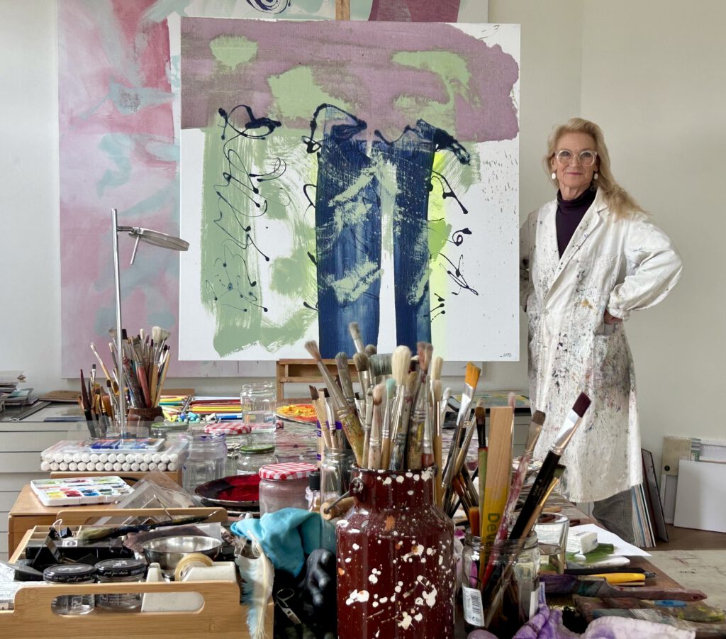 “In deze chaotische wereld is het nodig om in positieve verbinding te blijven met de ander maar ook met mijzelf. Deze positieve verbinding, oftewel energie die in mij zit, vertaal ik in tekens op het doek.
